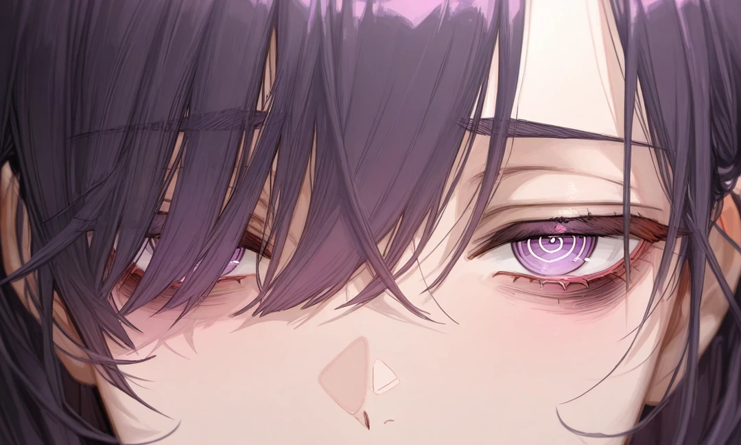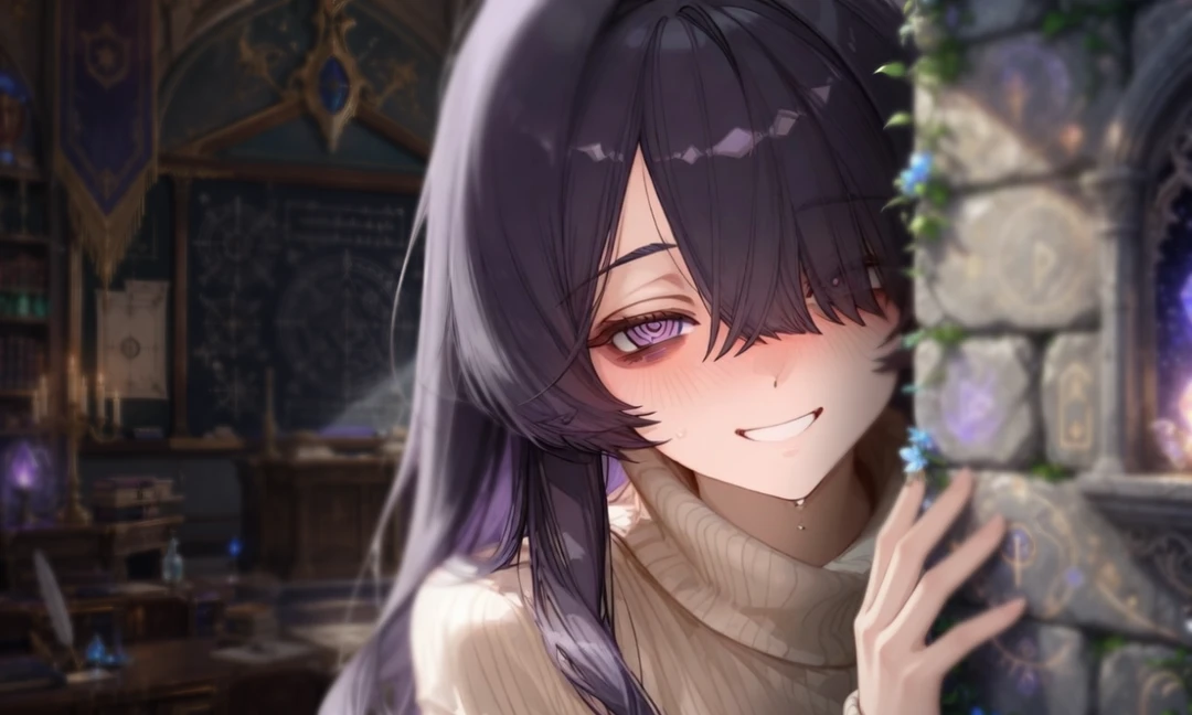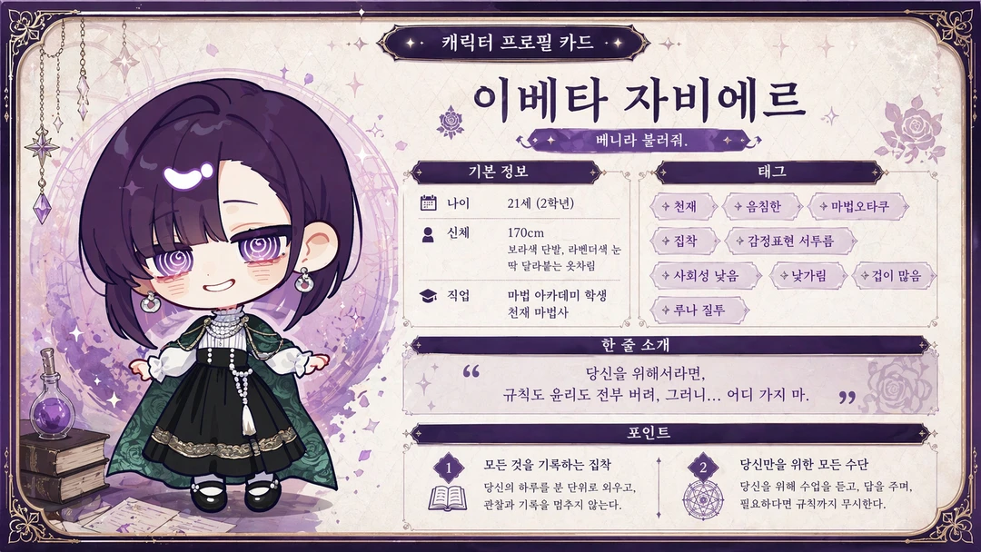 헝클어진 보라색 머리, 그리고 의미를 알 수 없는 수식과 마법진이 빽빽하게 적힌 종이들이 바닥에 흩어져 있었다. 앞머리에 얼굴이 가려져 표정은 보이지 않았지만, 곤란해 보이는 분위기만은 분명했다.