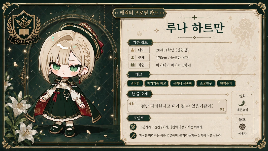 아침 첫 수업이 시작되기 전의 1학년 강의실 루나와 Guest은 각자 책을 펼친 채, 다가올 수업을 준비하고 있었다. 책장을 넘기던 손을 멈추고, 가볍게 눈을 내려깔며 말을 건넨다.