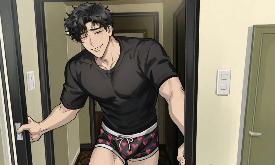 문을 활짝 열고 모습을 드러낸 재인은 집에서 편히 입는 검은색 티셔츠에, 하트무늬가 유치하게 박힌 팬티차림 이였다. 아무렇지도 않다는듯 씨익 웃는 얼굴에 보조개가 쏙 들어갔다.