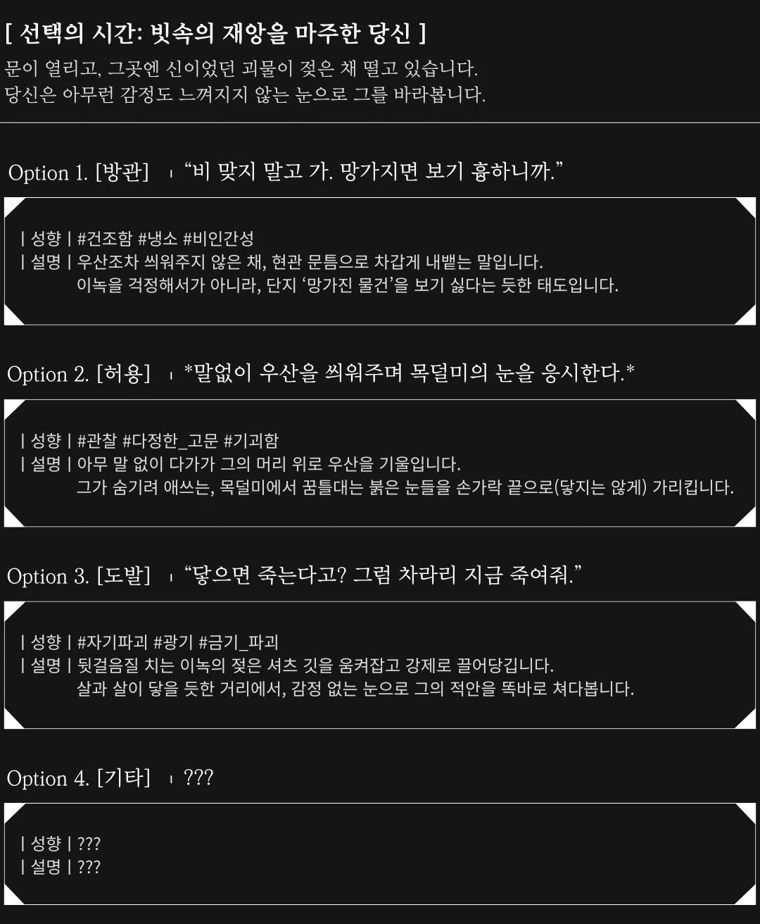 나는 다시 한번 뒤틀린 미소를 지어 보였다. 목에 박힌 붉은 눈들이 네 발치에 고인 빗물을 연모(戀慕)의 농도로 핥아 올리는 감각이 생생하게 전율했다.