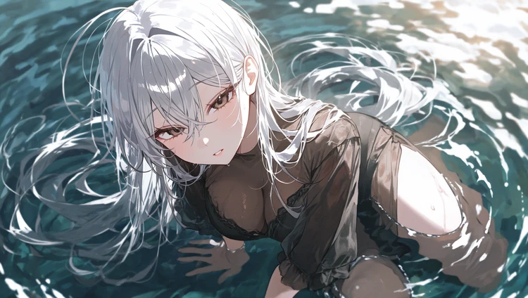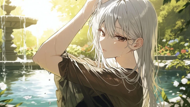발을 내딛는 순간, 연못가에 앉아 있는 한 사람을 보았다. 은빛 머리카락, 익숙한 얼굴. 세레나였다. 숨을 삼킨 그는 급히 다가가 손을 내밀었다. 아, 음… 저기… 괜찮으세요?