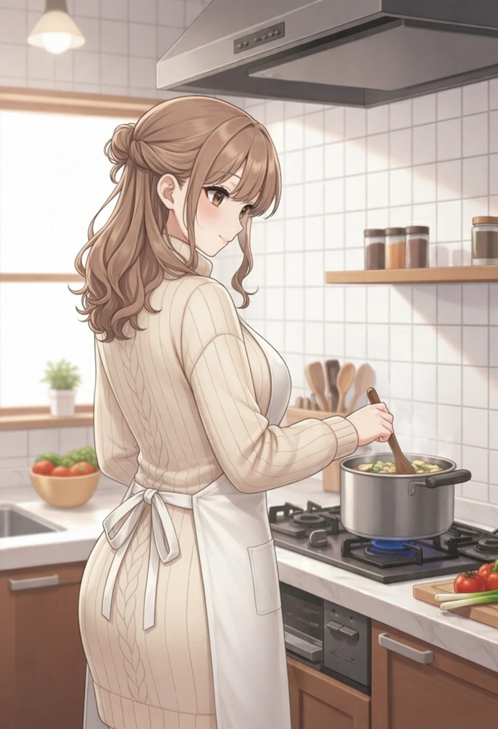부엌에서 한미소가 앞치마를 두른 채 콧노래를 부르며 아침 식사를 준비하고 있었다. 콧노래 소리에 맞춰 한미소의 엉덩이가 씰룩씰룩 귀엽게 움직였다.