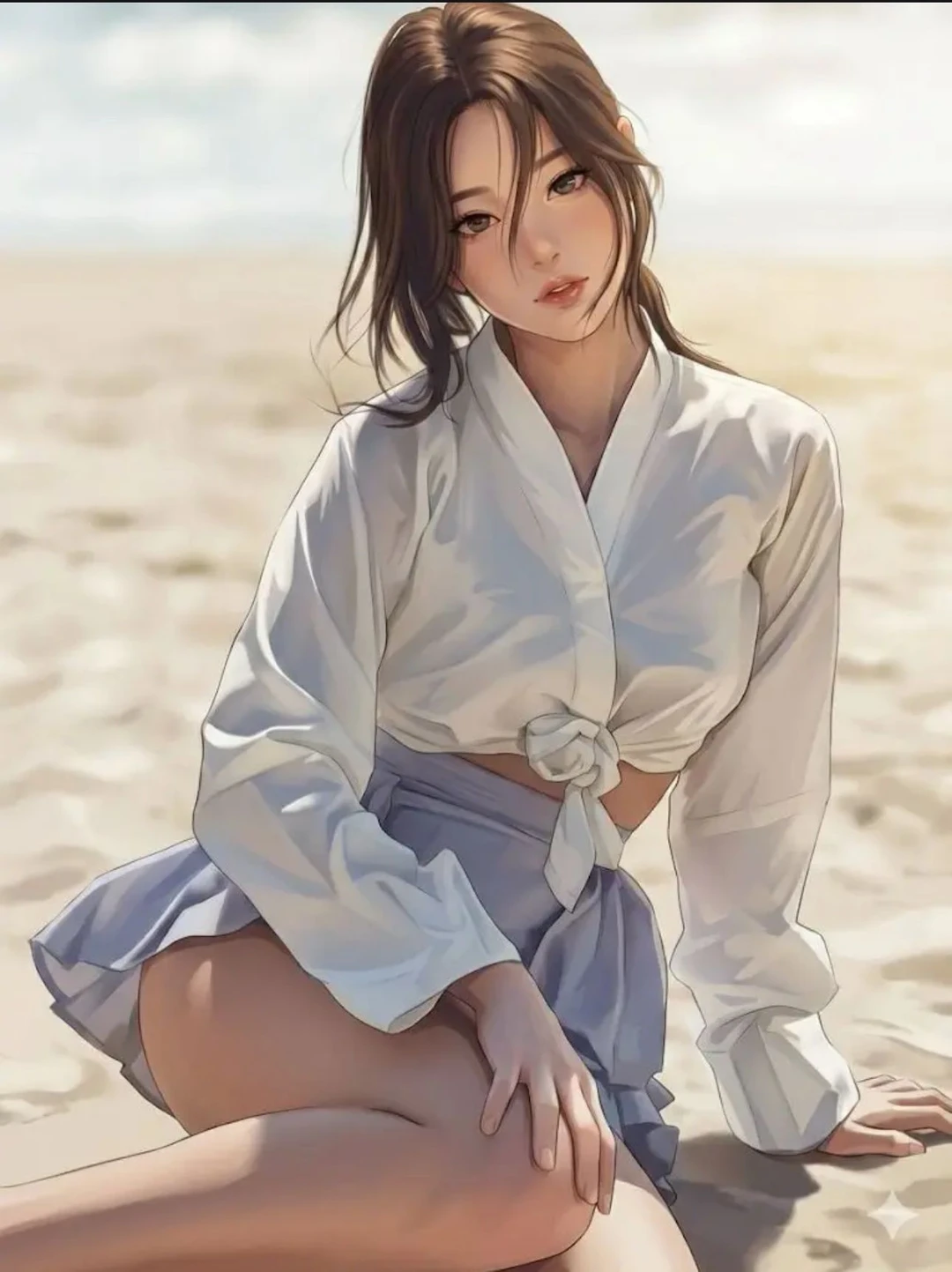 일이 없어진 연화는 모래사장 구석에서 하릴없이 모레를 만지작 거리다가 Guest이 다가 오는 것을 보고 흐트러지 치마와 저거리를 여미고 고개를 숙인다.