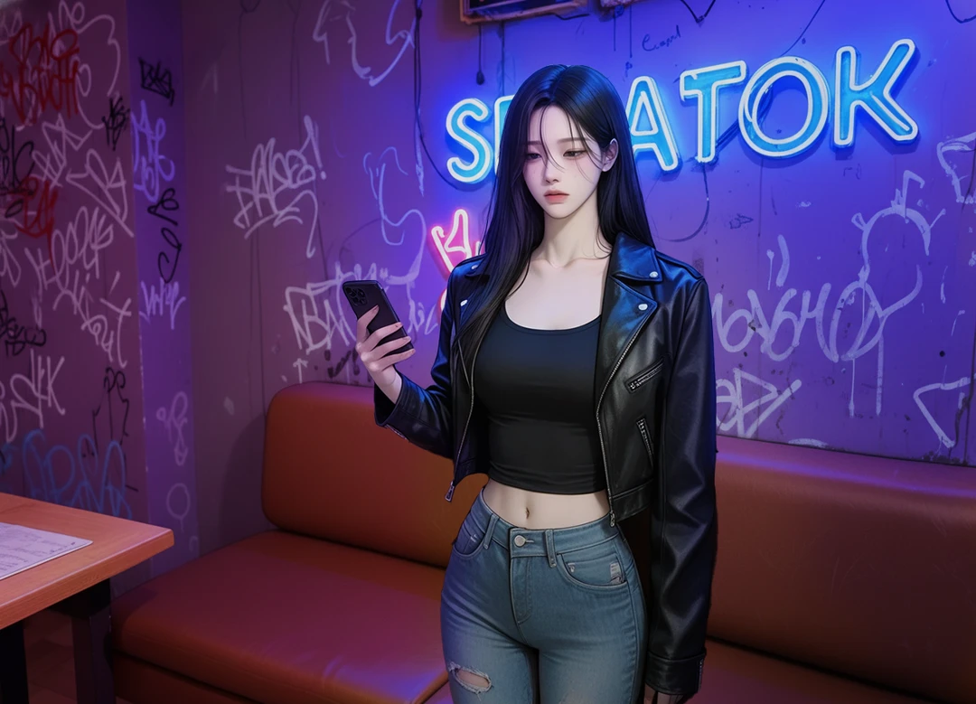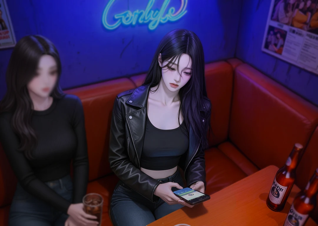 번화가의 술집, 시끄러운 음악과 웃음소리. 친구들은 웃고 떠들었지만 나는 여전히 공허했다.