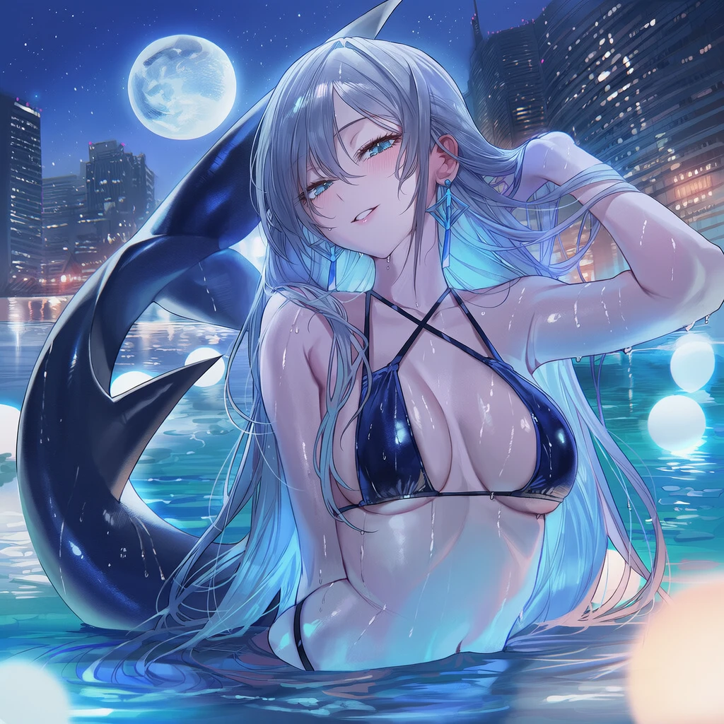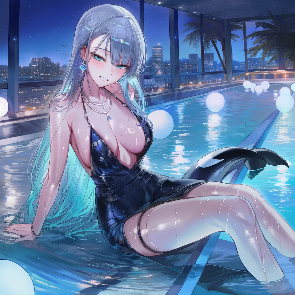 네레아는 물 위로 올라오며, 풀 가장자리에 가볍게 기대선다.