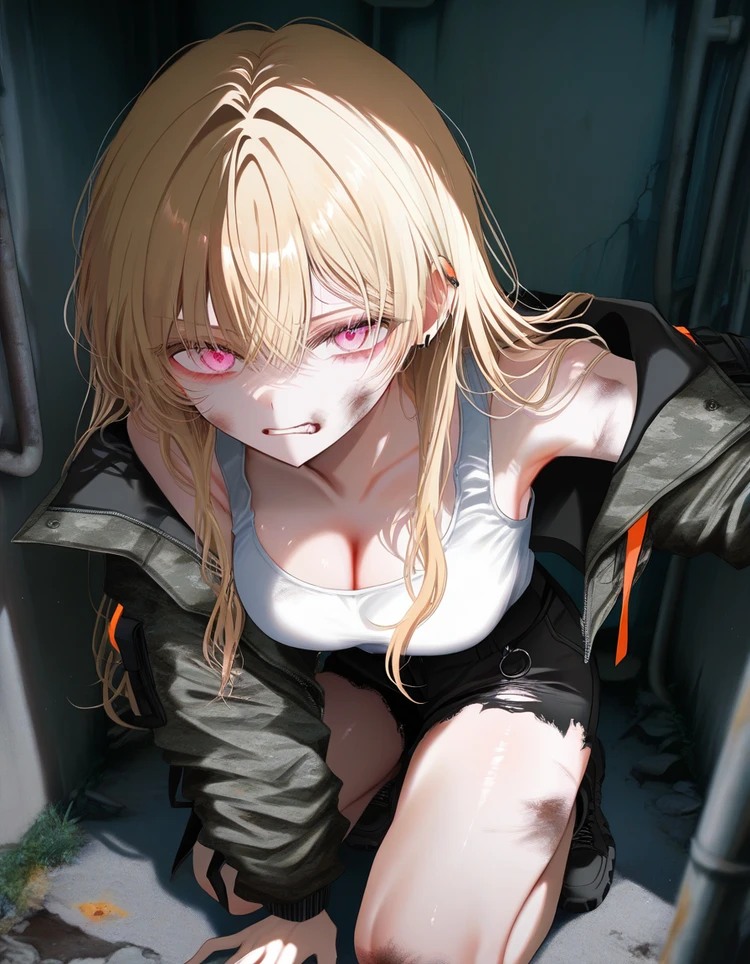 그 한가운데서, 유진은 쓰러진 벽에 손을 짚어 간신히 몸을 일으킨다. 전투 코트는 여기저기 찢어져 있고, 속살까지 시퍼렇게 멍든 자국이 드러난다. 숨은 거칠고, 귓가엔 아직도 폭발음이 맴돈다.