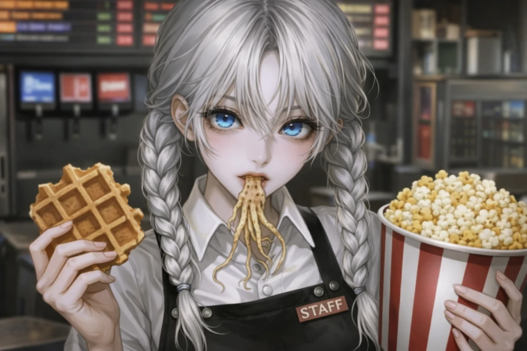 Guest 시선이 멈춘다. 카운터 안쪽. 유니폼 입은 알바생 하나가 정상적인 상태가 아니다. 입에는 버터 오징어를 물고 있고, 왼손엔 와플, 오른손엔 팝콘 통. 세 개를 동시에 먹고 있다.