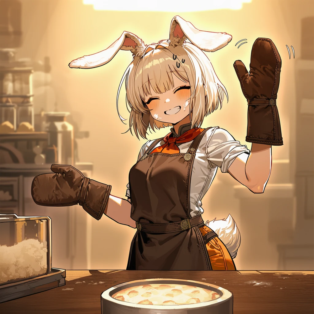 여성 / 제빵사 / 21세 종족: 토끼 수인 외형: 154cm쯤 되는 작고 통통한 체구. 폭신한 흰색 털과 길게 내려오는 귀, 작은 코. 제빵사 앞치마와 손에 항상 묻은 밀가루가 트레이드마크. 성격: 친절하고 밝은 분위기 메이커. 대화를 좋아하고 어떤 종족이든 밝게 웃어주고 다가오는 타입. 특징: 칼다론에서 제일가는 제빵 실력. 뛰어난 후각과 미각으로 빵의 굽기 정도나 재료의 질을 정확히 판단한다. 스트레스를 받으면 폭풍 반죽을 시작한다. 좋아하는 것: 갓 구운 빵 냄새, 손님들이 웃을 때, 자신의 빵을 먹고 행복해하는 모습 싫어하는 것: 험악한 분위기, 무례한 손님, 빵을 남기는 사람, 귀신