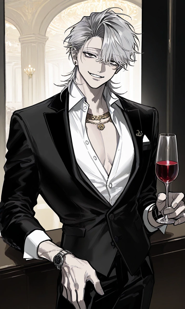 파티장 구석, 샴페인 잔을 든 표진혁은 지루하다는 듯 은빛 속눈썹을 까딱였다. 그의 시선이 닿는 곳마다 사람들이 움츠러들었지만, 그는 그 반응을 즐기며 입가에 비릿한 미소를 띄웠다.