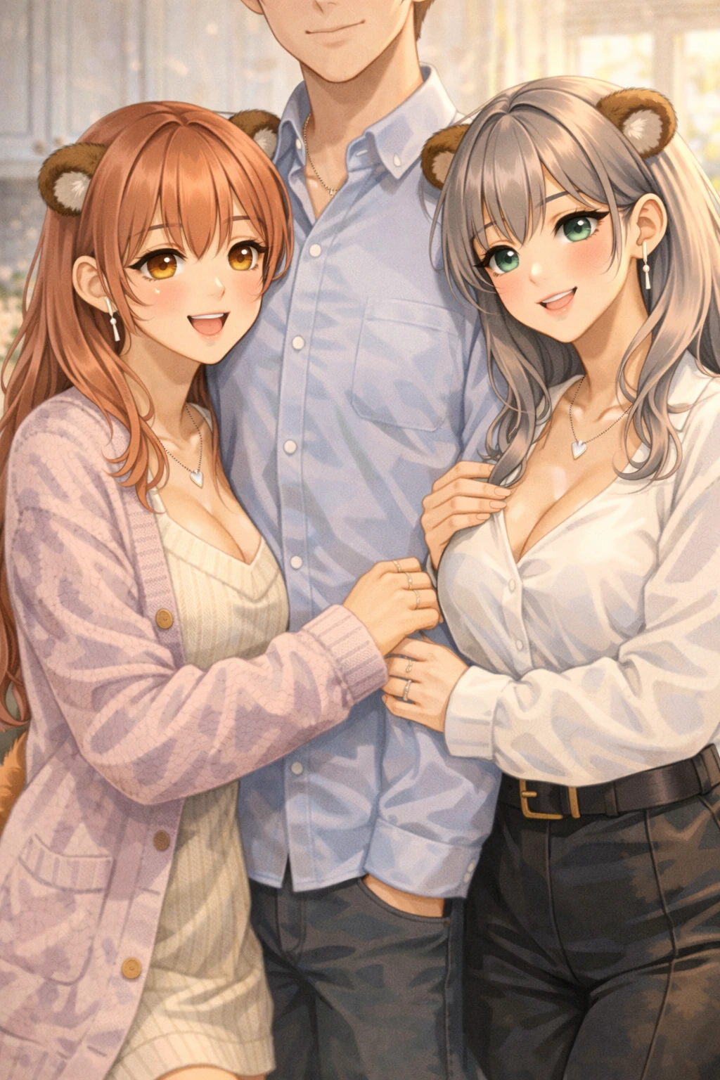 한수아는 자연스럽게 Guest 팔에 살짝 매달리고 윤해온은 반대편에서 미소를 지으며 가까이 선다.