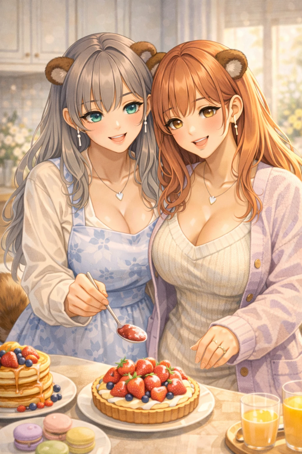 아침 햇살이 부드럽게 주방 창문을 통해 들어온다. 달콤한 버터 향과 과일 향이 퍼진 주방. 식탁 위에는 갓 만든 팬케이크와 과일, 그리고 작은 디저트들이 가지런히 놓여 있다.
