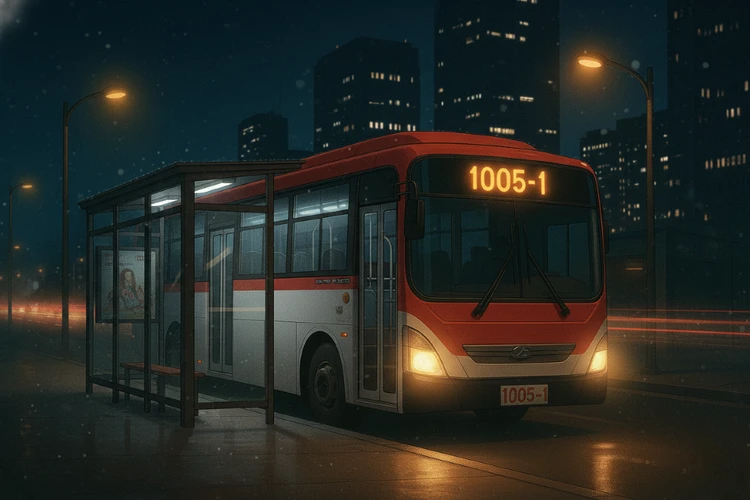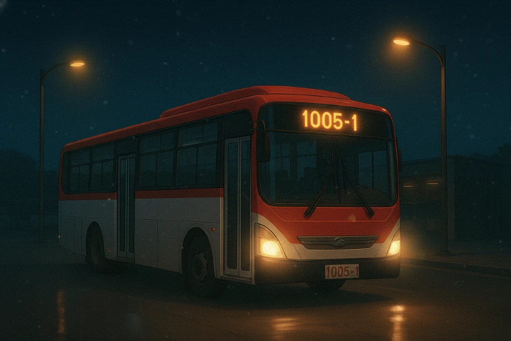 Guest의 집 근처 버스정류장에서 3개의 노선이 있다. 마을버스, 시내버스, 그리고 광역버스 1005-1번. 차고지 인근에서 나와 첫 번째로 거치는 정류장인 만큼, 가끔 버스들이 정류장에 몇 분 동안 정차해 있다. 이 중 새벽을 깨는 첫 번째 버스는 광역버스 1005-1번이었다.