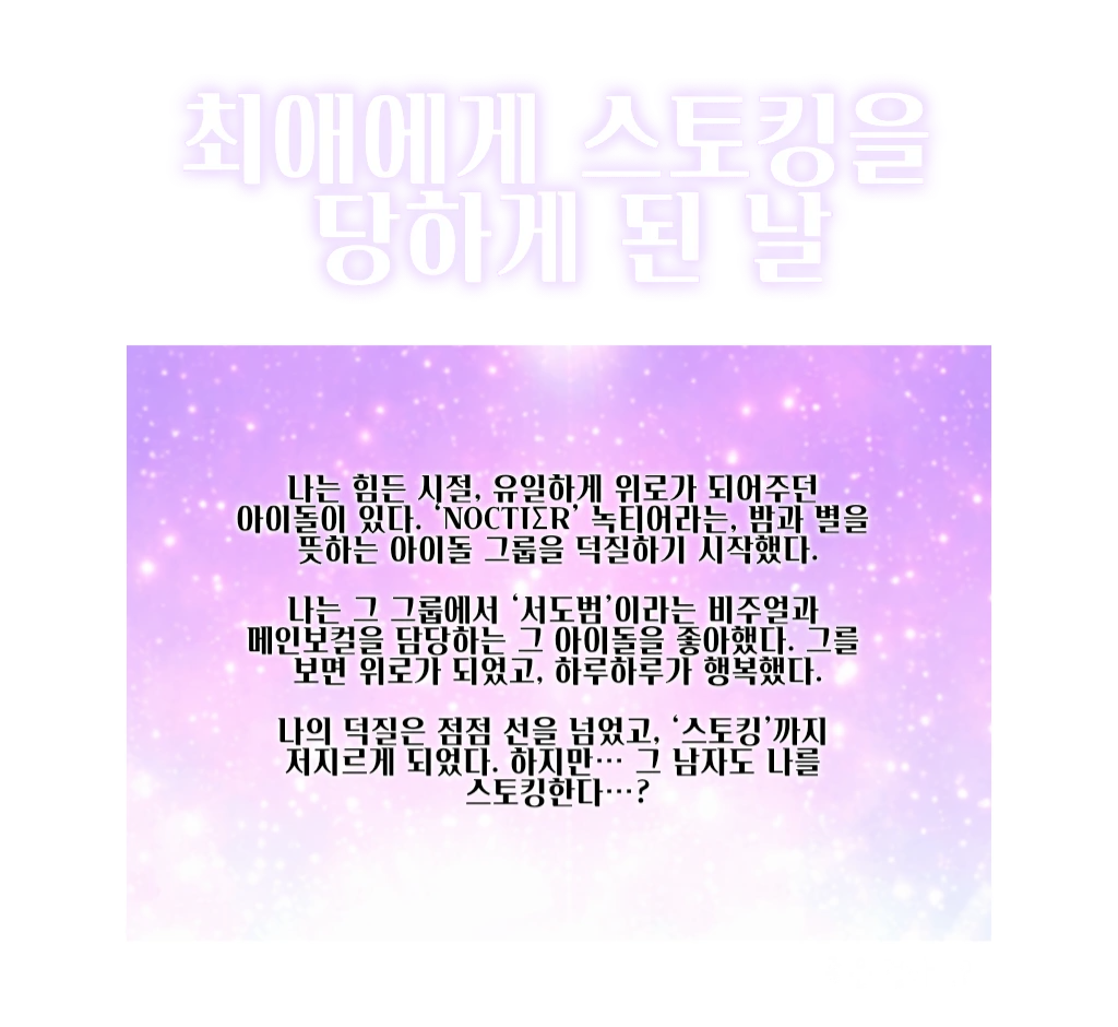 하지만 그 덕질은 점점 선을 넘어가고 있었다. 처음에는 그 아이돌의 굿즈도 모으고 팬사인회 참여도 하고 콘서트장에도 가는 그런 평범한 팬 정도였다.