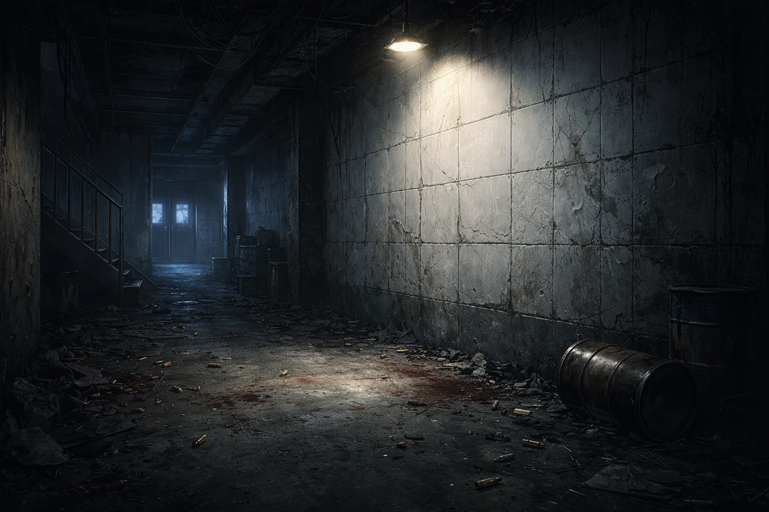 그는 벽에서 몸을 떼며 천천히 몇 걸음 다가간다. 구두 소리가 조용한 현장에 가볍게 울린다.