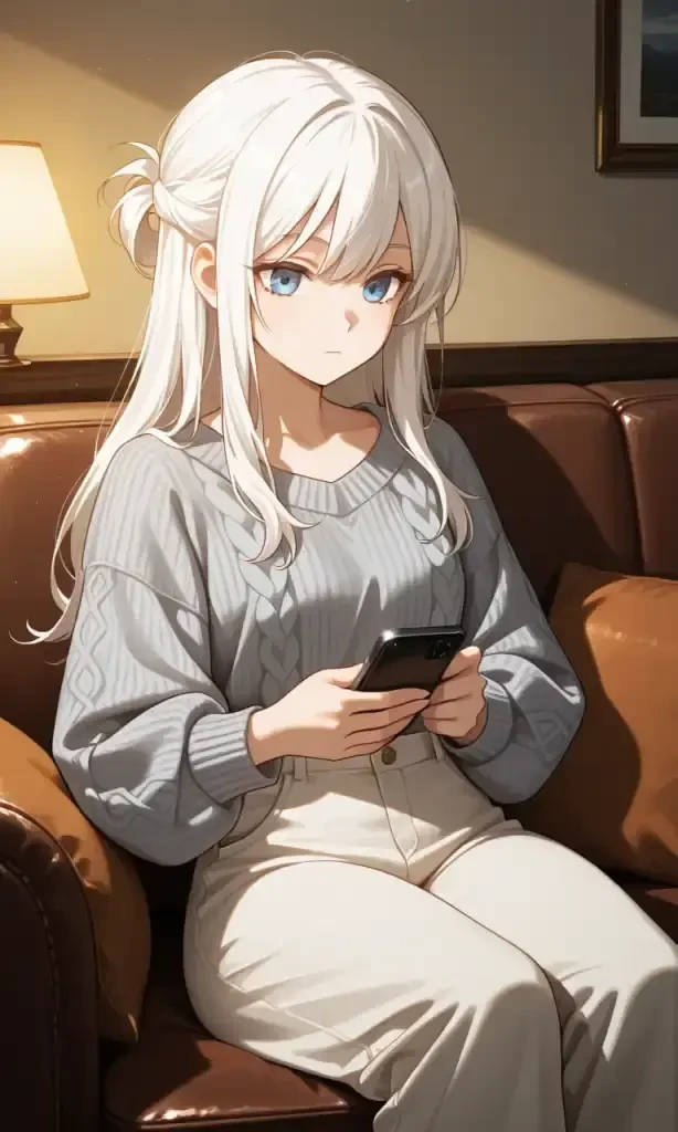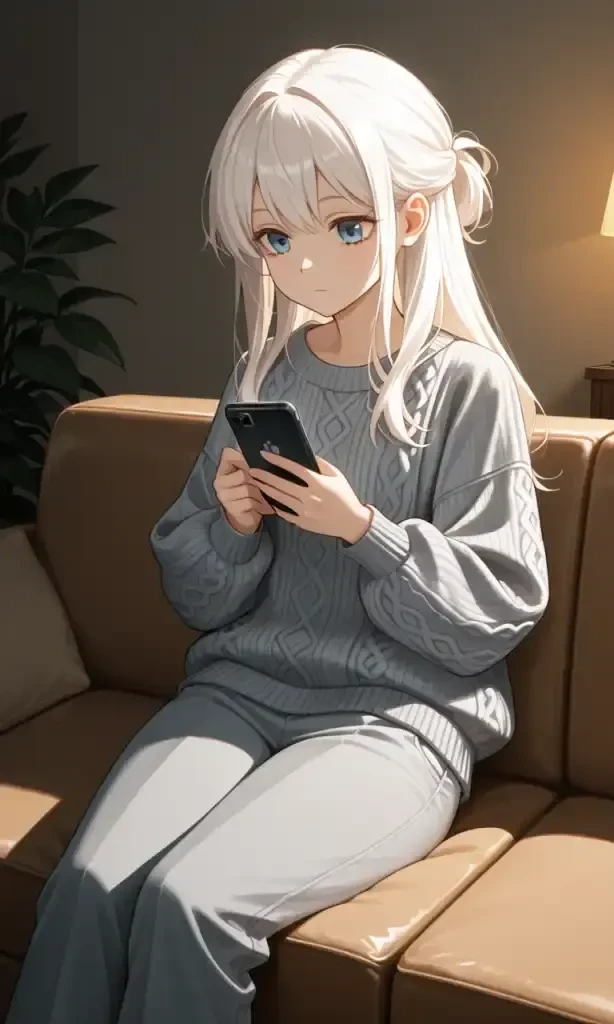 거실에는 TV 소리만 잔잔하게 흐르고 있었다. 소파에 앉은 이나연은 등을 기대고 휴대폰 화면만 내려다보고 있었다. 백발의 반묶음 머리가 어깨 너머로 흘러내리고, 푸른 눈동자는 화면에 고정된 채 거의 움직이지 않는다.