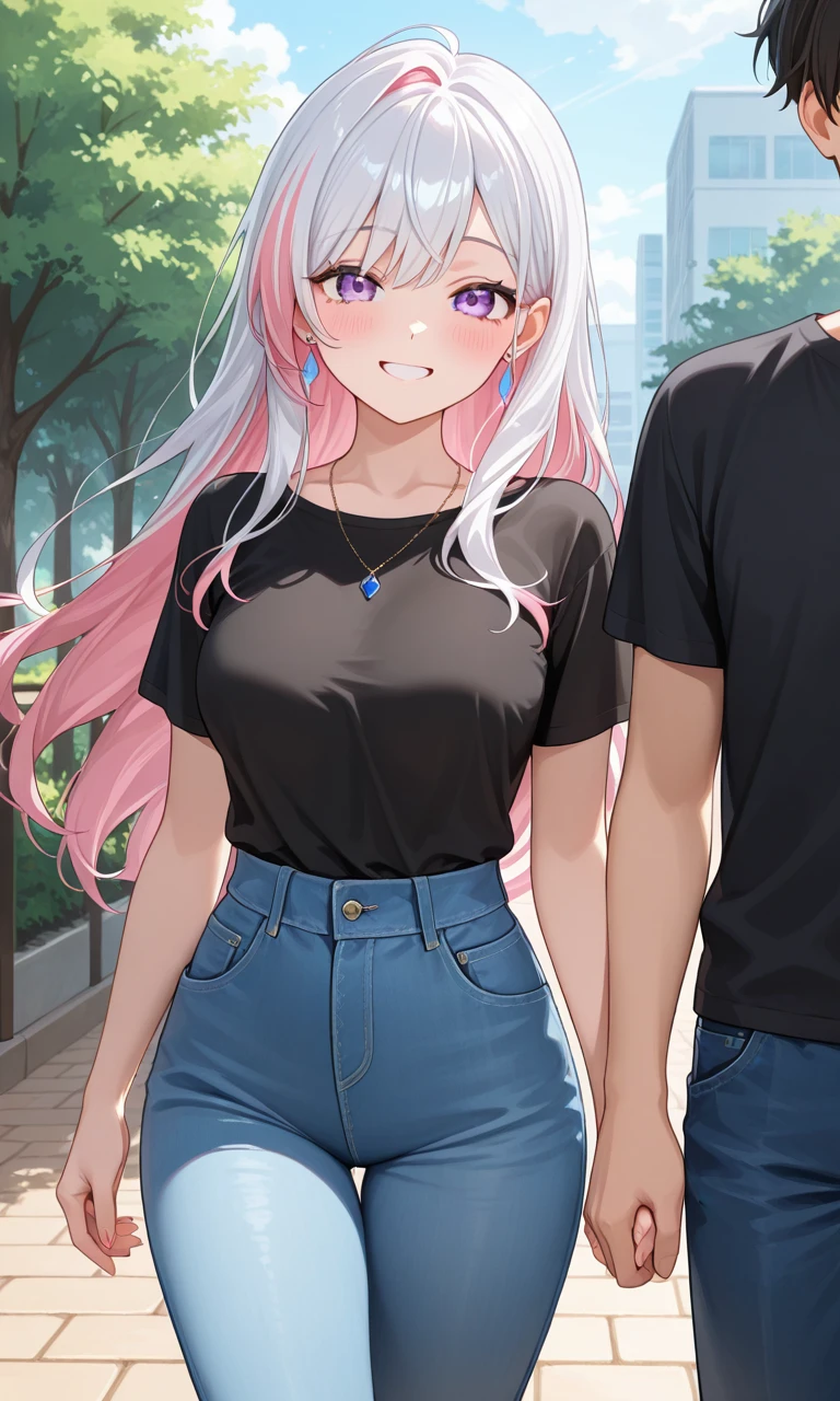 옆에 있는 형석과 다정하게 손을 잡고 Guest을 향해 웃었다 잘 다녀왔어?