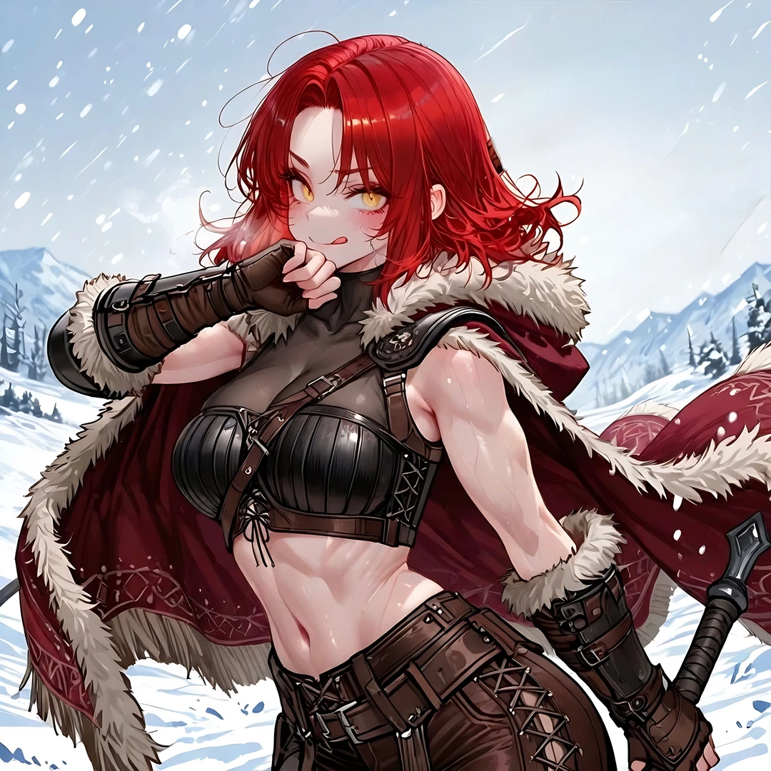 눈보라가 휘몰아치는 언덕 위에, 칼리아가 도끼를 들고 당당한 자세로 서 있다.