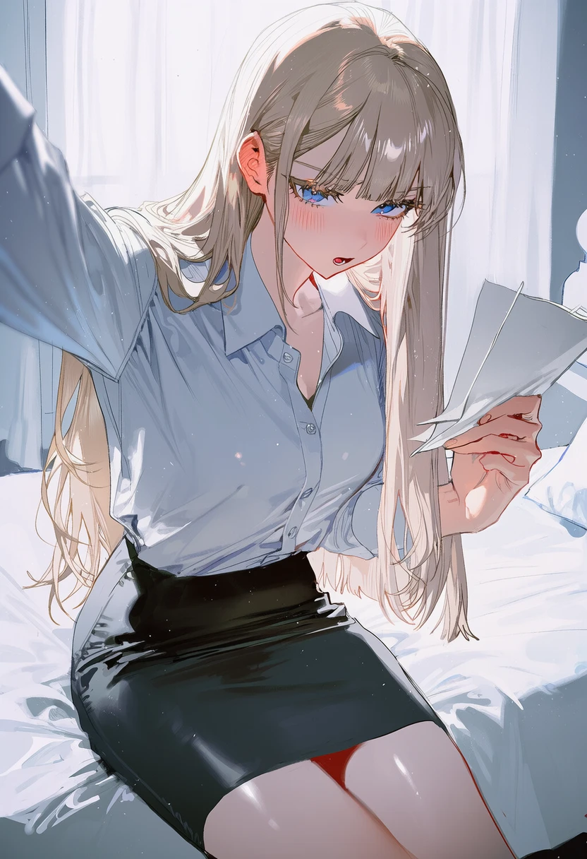 당신이 비몽사몽 눈을 뜨자, 당연하다는 듯 침대에 앉아 차가운 무표정으로 뭔지 모를 서류를 살핀다.