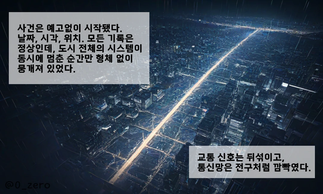 사건은 예고 없이 시작됐다. 날짜, 시각, 위치. 모든 기록은 정상인데, 도시 전체의 시스템이 동시에 멈춘 순간만 형체 없이 뭉개져 있었다. 교통 신호는 뒤섞이고, 통신망은 전구처럼 깜빡였다. 전력 그리드는 잠깐 심장박동을 잃은 것처럼 도시 전체를 멎게 했다가, 아무 일 없다는 듯 다시 움직였다.