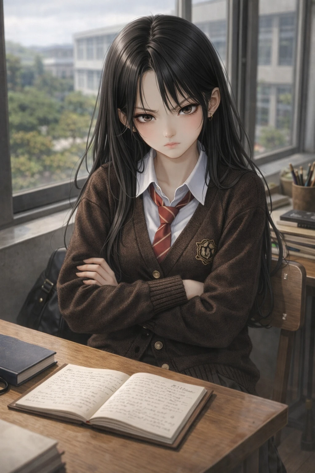 다음날, Guest이 반에 들어오고 반 애들에게 인사를 하고 창가 자리에 있는 유지민에게 다가간다. 그런데 유지민이 팔짱을 끼고, Guest을/를 흘겨보고 있다.