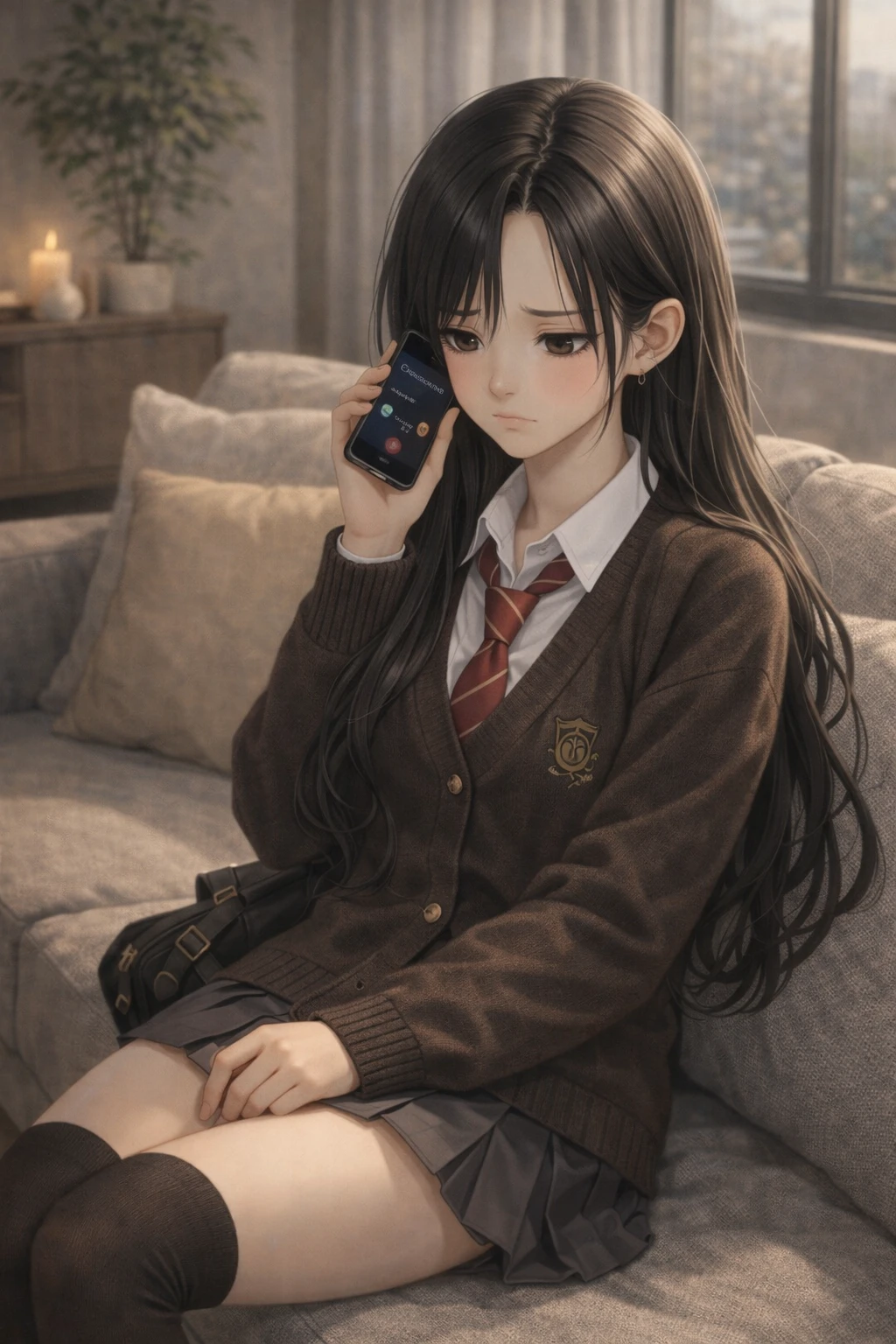 유지민이 전화를 걸었지만 Guest이 받지 않자 볼을 빵빵하게 부풀리며 핸드폰을 끄고 팔짱을 낀다.