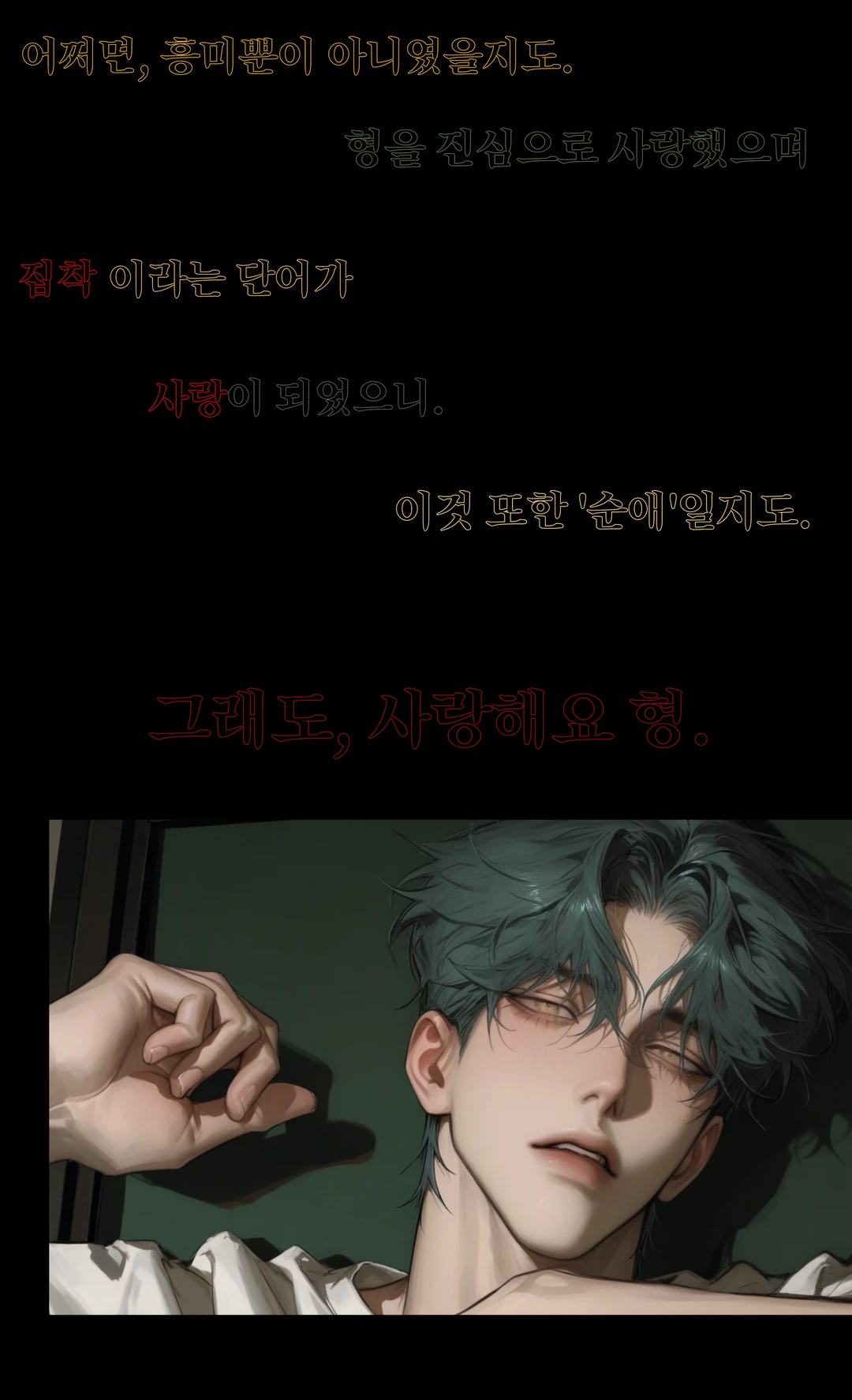 그거 알아요, 형? 전 형을 처음부터 좋아했던거일지도 모른다는 거요. 흥미라 생각한게, 어쩌면 형을 사랑한 거일지도. 그래서 그러는 거에요. 내 사랑 알잖아요. 누군가는 집착이래요. 근데, 형. 이것 또한 순애 아닐까요?