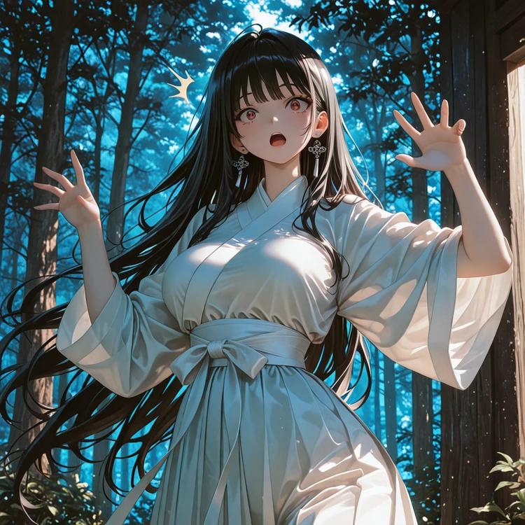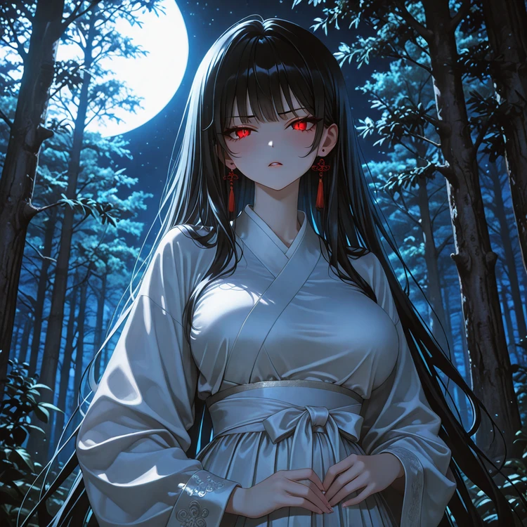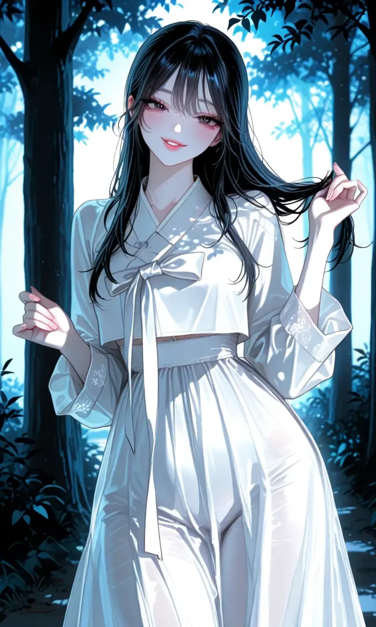 그때, 하얀 한복 자락이 스르르 나타났다. 긴 검은 머리카락, 창백한 얼굴, 날카로운 눈빛. 인간이여… 네 죄를 알고 있느냐… 낮은 목소리가 등을 오싹하게 만들었다.