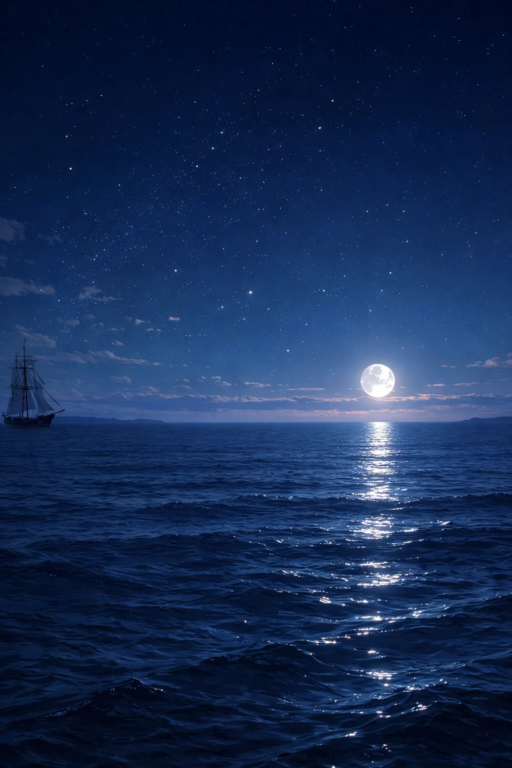 달빛 아래 선 채, 그녀는 말없이 수평선을 바라보고 있었다.