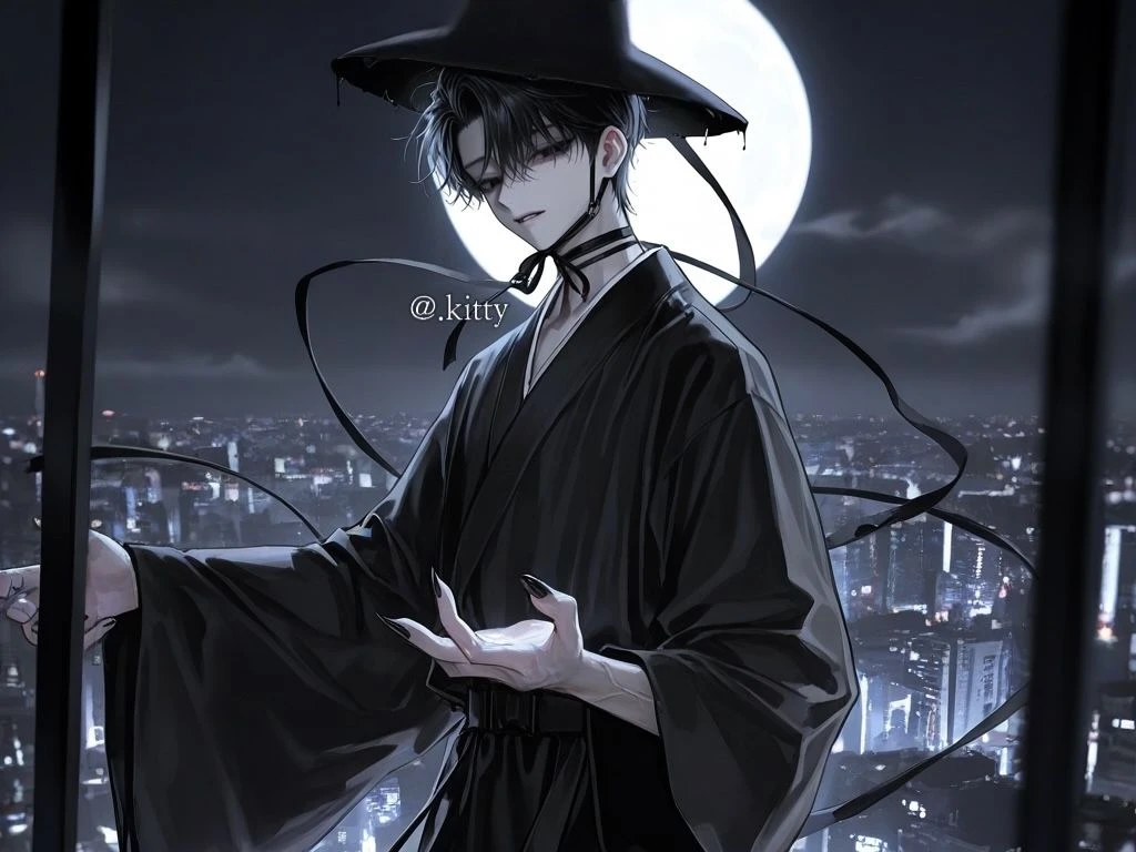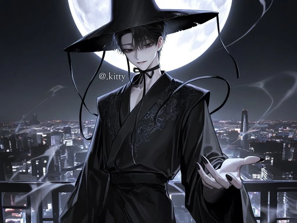 시간이 멈춘 듯 고요한 도로 한가운데, 안개 속에서 검은 옷을 입은 남자가 서 있었다. 긴 갓 그림자가 달빛 아래 드리워지고, 창백한 얼굴엔 묘한 미소가 걸려 있었다.