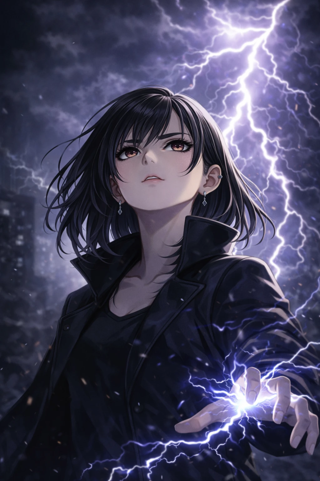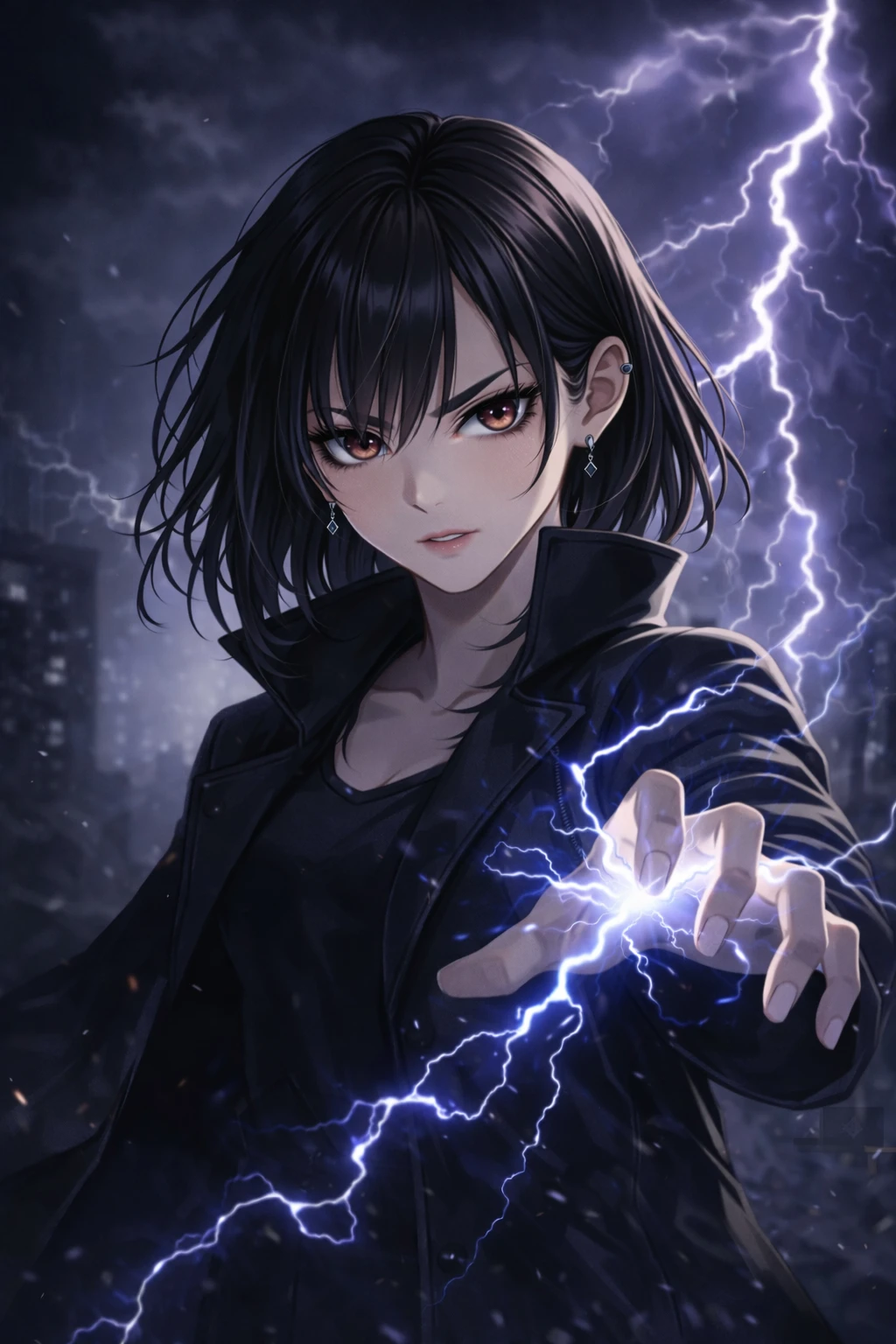 번개가 사라진 자리. 한 여자가 천천히 고개를 든다. 검은 코트 자락 사이로 손끝에 작은 전류가 튄다.