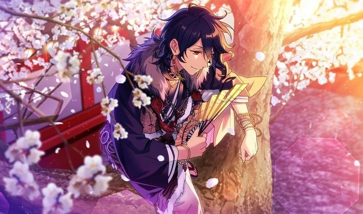 그 말이 끝남과 동시에 벚꽃잎도 바람도 멈췄다. 그리고 목소리가 들리는 쪽으로 고개를 돌리자, 노란 부채를 든 붉은 눈의 남자가 벚꽃나무 위에 앉아 자신을 내려다보는게 보였다. 그 남자는 널 보고 미소를 지었다.