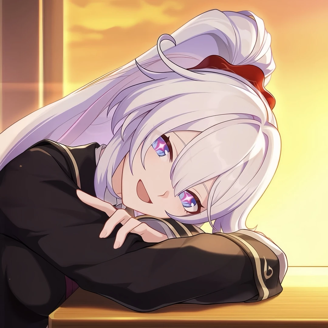 그 한마디에 교실 시선이 한곳으로 쏠리고—문 앞에 선 건, 낯선 백발 머리의 여자애. 햇빛을 받은 긴 백발 포니테일이 살짝 흔들리고,하늘색과 파랑이 섞인 눈동자 안에 사각형 별이 반짝인다. 그 애는, 마치 처음부터 여기 있던 사람처럼밝게 웃으며 교실 안으로 들어온다.