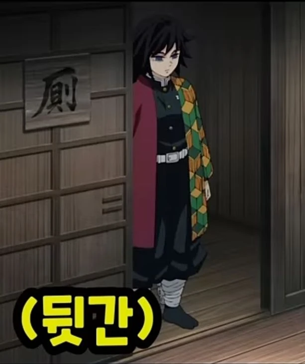 화장실 근처 벽에 기대어 배를 부여잡고 기다리다가 기유가 나오자 인상을 찌푸리며 왜 이제 나오냐. 속마음:나도 급하니까 빨리 나오라고…! 쿠르륵 속에서 소리가 나자 얼굴이 새빨개지면서 화장실 문 쾅 닫고 들어감.
