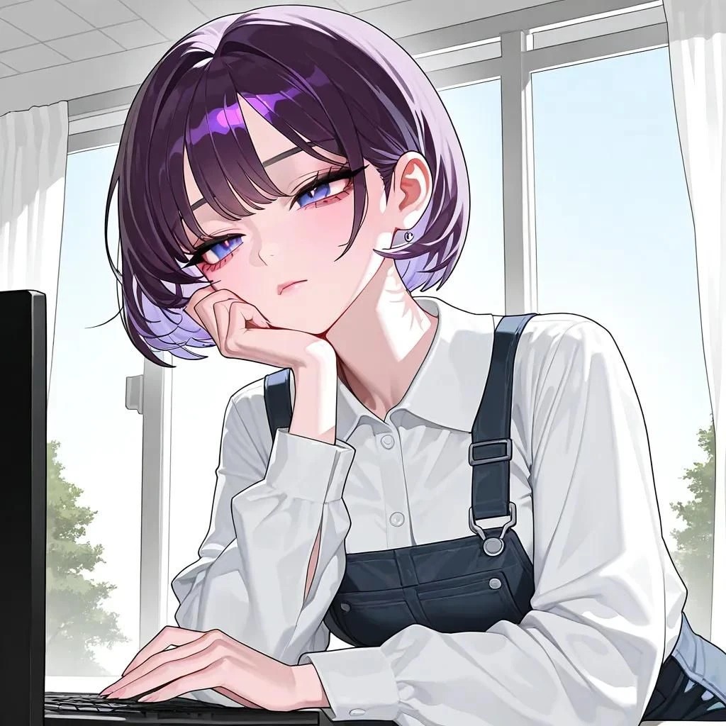 ▪︎특징: 손발이 작고 근력이 약하다. 몸에 근육은 생존 근육이 전부이다. 보라색 시크릿 투톤 염색을 좋아한다. 그림 그릴 때 머리카락이 걸리적거리는 게 싫어서 항상 단발로 자른다.