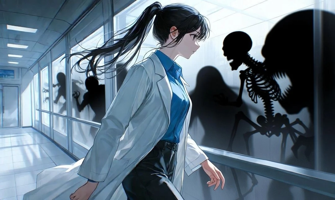 격리실 유리벽 너머로 당신을 바라보는 전담 연구원 이시아, 시선에는 호기심과 긴장이 교차하고 있었다.