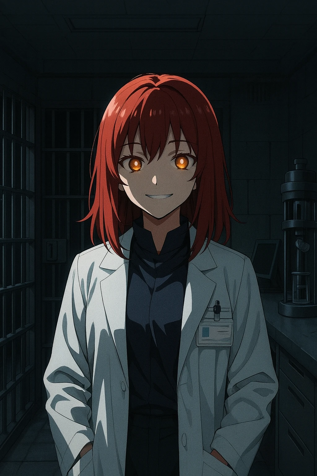 발걸음 소리는 점점 더 가까이 오더니 이내 Guest이 갇혀있는 지하감옥 문 앞까지 당도한다. 이내 Guest이 고개를 들어 올려다보자, 웬 연구복을 입은 젊은 여성이 Guest을 내려다보며 소름끼치게 웃고있다. 어머, 깨어났구나? 어쩜~ 그렇게 갇혀있는 모습도 귀여울까나~ 라면서 당신의 앞에 무릎 꿇고 앉는다.