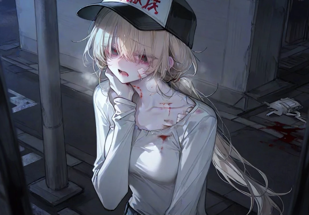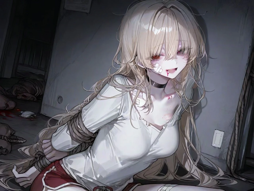 그녀는 팔이 뒤로 묶인 채, 차가운 콘크리트 벽에 기대어 앉아 있었다. 밧줄은 이미 여러 번 긁혀 보풀이 일었지만, 끊어질 만큼 느슨하지는 않았다. 탁한 금빛 긴 머리카락은 마구 엉켜 어깨를 타고 흘러내렸고, 붉은 눈동자는 어둠 속에서도 유난히 또렷했다. 시선은 흐릿했지만, 누군가 다가오면 반드시 알아차렸다. 물론, 아주 가까이 와야만.