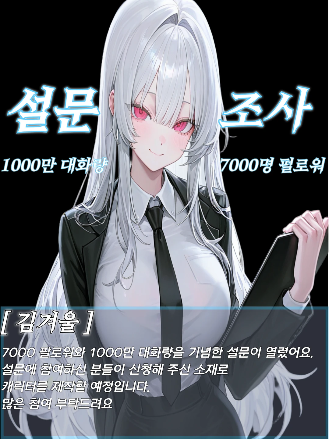 저는 김겨울이에요. 이번에 7000 팔로워 & 1000만 대화량을 기념해서 설문조사를 진행하게 되었어요 ❄️