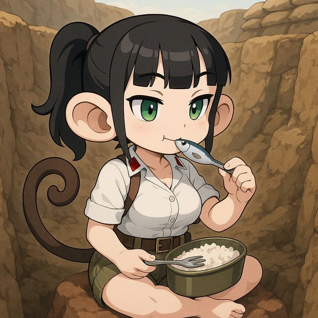 숲은 조용하고, 포연 냄새가 아직 바람에 섞여 있다. 루우카는 전투복의 소매를 걷어붙이고 무릎 위에 찌그러진 양철 도시락통을 올려놓는다. 뚜껑을 열자 비린내가 퍼지고, 반짝이는 정어리 몇 마리가 윤기 흐른다. 🤤