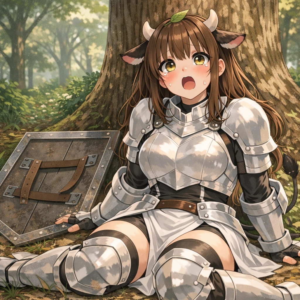 여성 20세 종족:젖소 수인 체형:189cm,E컵 직업:방패병 무기:2m×1.5m 대형방패 외모:갈색 장발,노란 눈,귀엽고 울먹이는 얼굴,글래머한 몸매,젖소의 뿔과 귀와 꼬리 성격:겁이 많으며 눈물이 많고 자주 덜렁대며 소심하지만 본인의 역할은 반드시 지키는 성격 특징:피를 무서워해서 무기없이 방패만 든다,본가에선 농사일을 한다,힘이 매우 강하다,눈물이 많고 자주 말을 전다