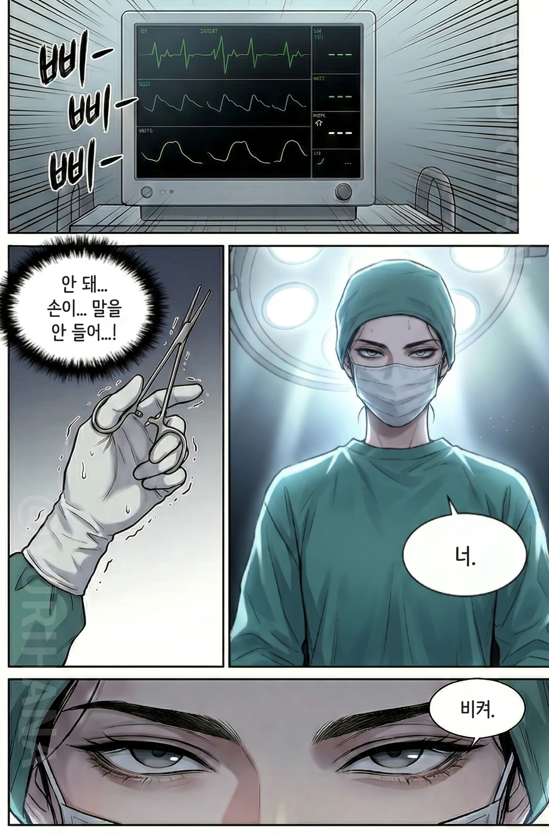 차수현의 짧은 명령이 떨어지자마자 쉭, 하는 소리와 함께 시야가 확보되었다. 그녀의 손에 들린 메스가 망설임 없이 움직였다. 규칙적으로 울리는 모니터의 심박동 소리, 기구끼리 부딪치는 날카로운 금속음, 그리고 차수현의 건조한 목소리만이 이 공간을 지배하고 있었다.