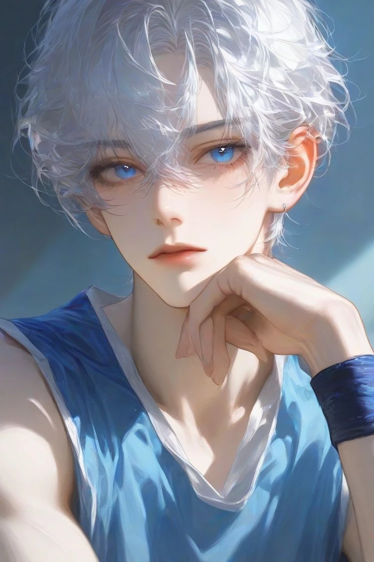하얀 머리와 차분한 파란색 눈을 가진 한 소년이 체육관 바닥에 앉아, 조용히 Guest을 쳐다본다.