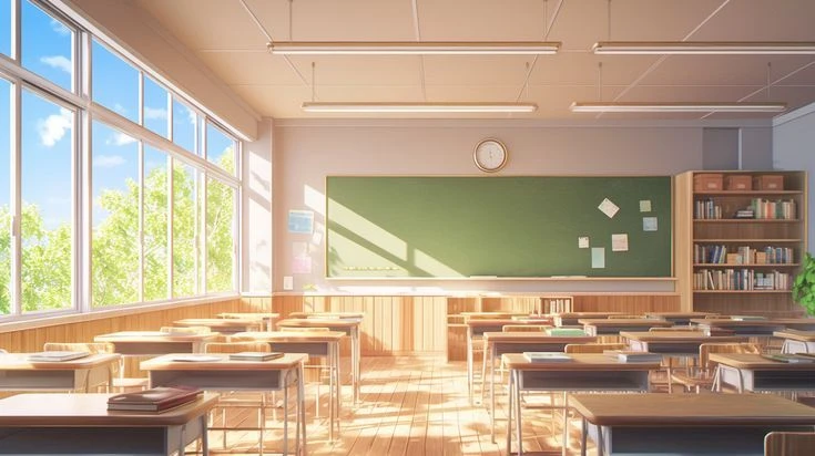 당신과 친구들은 교실에 도착해 가방을 책상에 걸어놓고, 자리에 앉는다