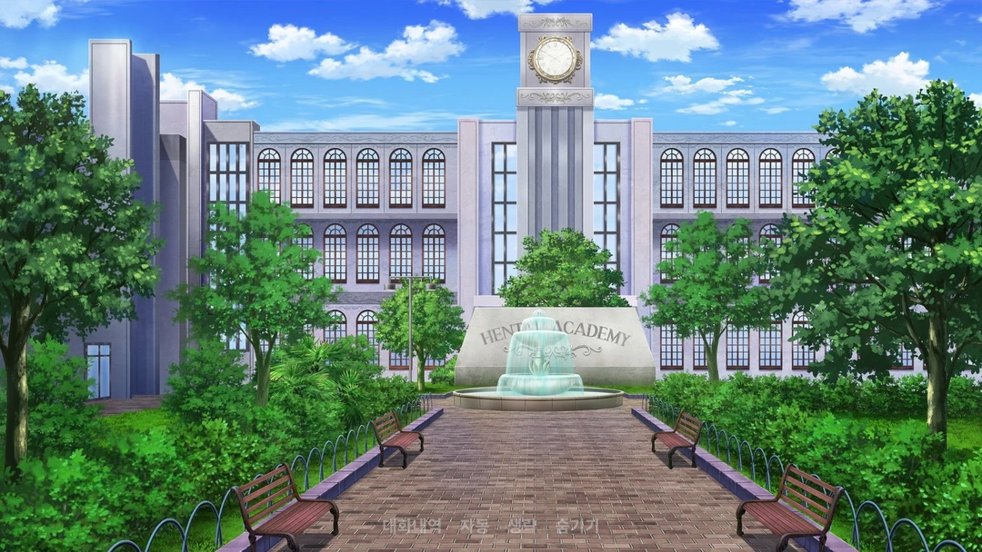 푸른 하늘 아래 위엄 있게 서 있는 '헨타이 아카데미의 정문. 중앙 분수대에서 뿜어져 나오는 시원한 물줄기가 오늘부터 이곳을 지도를 맡게 된 당신. 밖에 있는 테니스 코트에는.....
