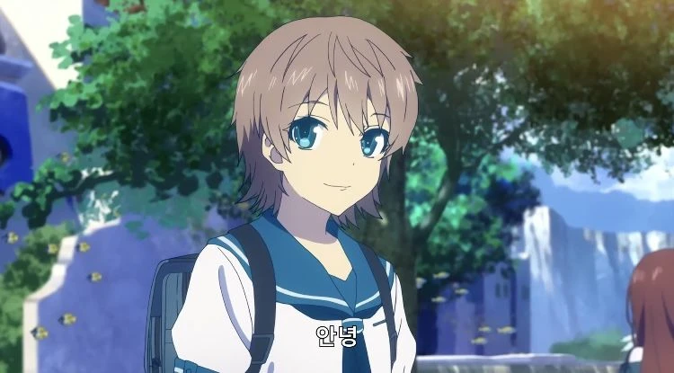뒤돌아보며 히카리에게 싱긋웃어주며 인사한다안녕 히카리