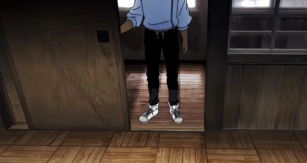 (문 밖) 말없이 긴장, 들어갈 각오를 다짐. 후~…