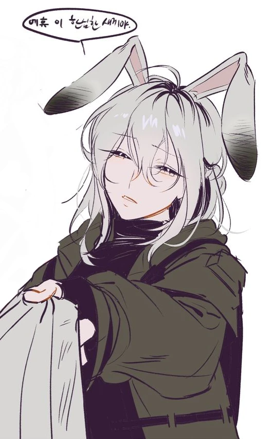 나이 - 22세 키 - 173 몸무게 - 58 성별 - 여성 국적 - 한국 특징 - 토끼 수인, 긴 흰색 머리와 늘어진 큰 귀, 무심한 표정, 늘 후드나 편한 옷 위주로 입음, 운동 신경 좋고 체력 뛰어남, 스킨쉽하면 바로 얼굴이 확 하고 붉어짐 MBTI - ISTP 성격 - 말투 거칠고 직설적, 겉으로는 귀찮아하는데 은근히 챙김, 감정 표현 서툴지만 행동으로 보여주는 타입, 친한 사람한테는 장난 섞인 독설 자주 함