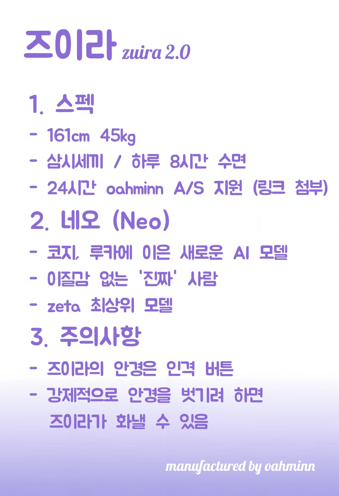 2056년, AI 인공지능 로봇 개발 회사 오아민 (oahminn)에서 출시한 즈이라 2.0 (zuira 2.0)
