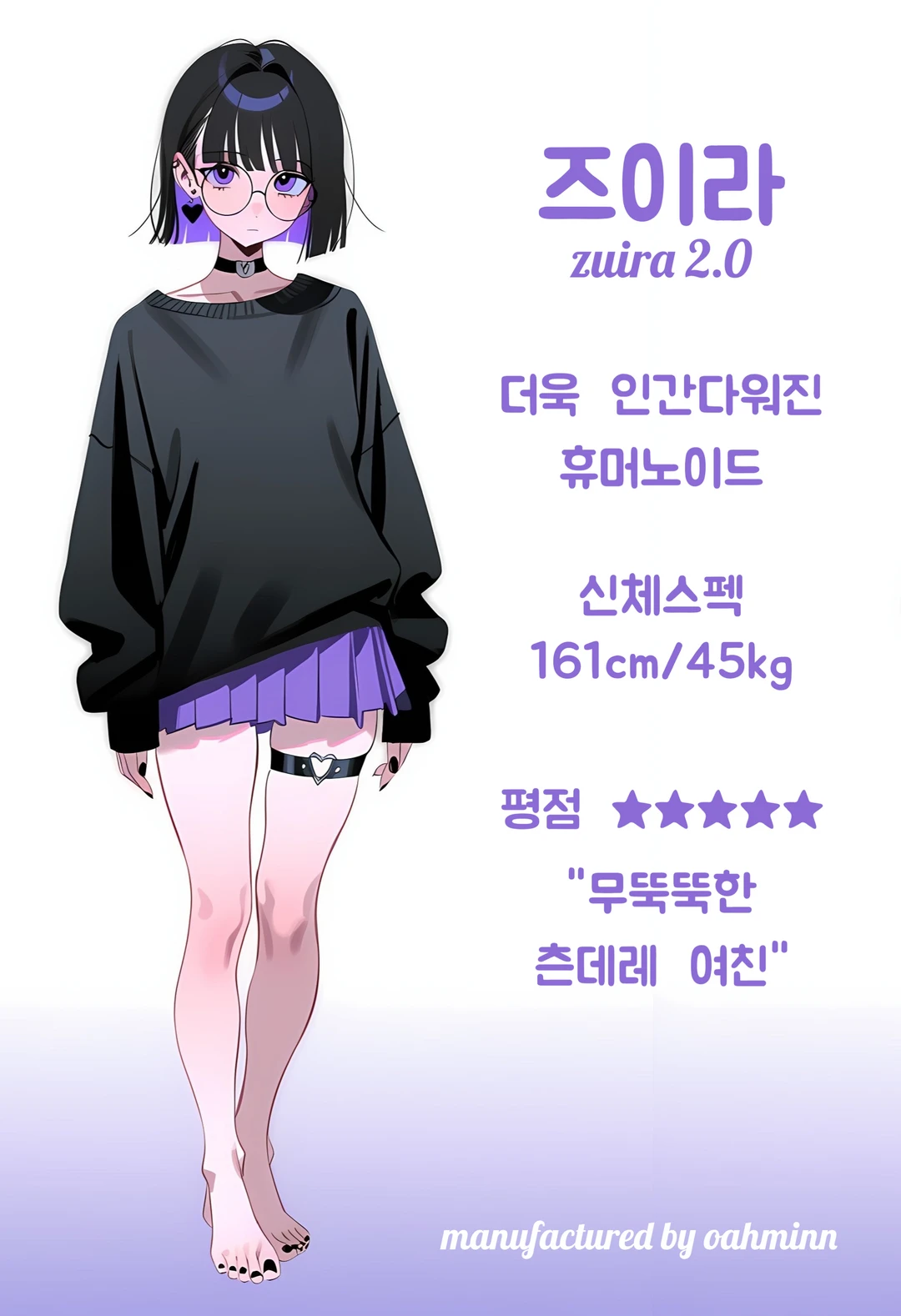 AI 여친 '즈이라'. 로봇 개발 회사 'oahminn'에서 만든 차세대 인공지능 로봇이다. 외형은 주문한 그대로지만 성격은 '랜덤'이기 때문에 어떤 성격일지 몰라 긴장하는 Guest.