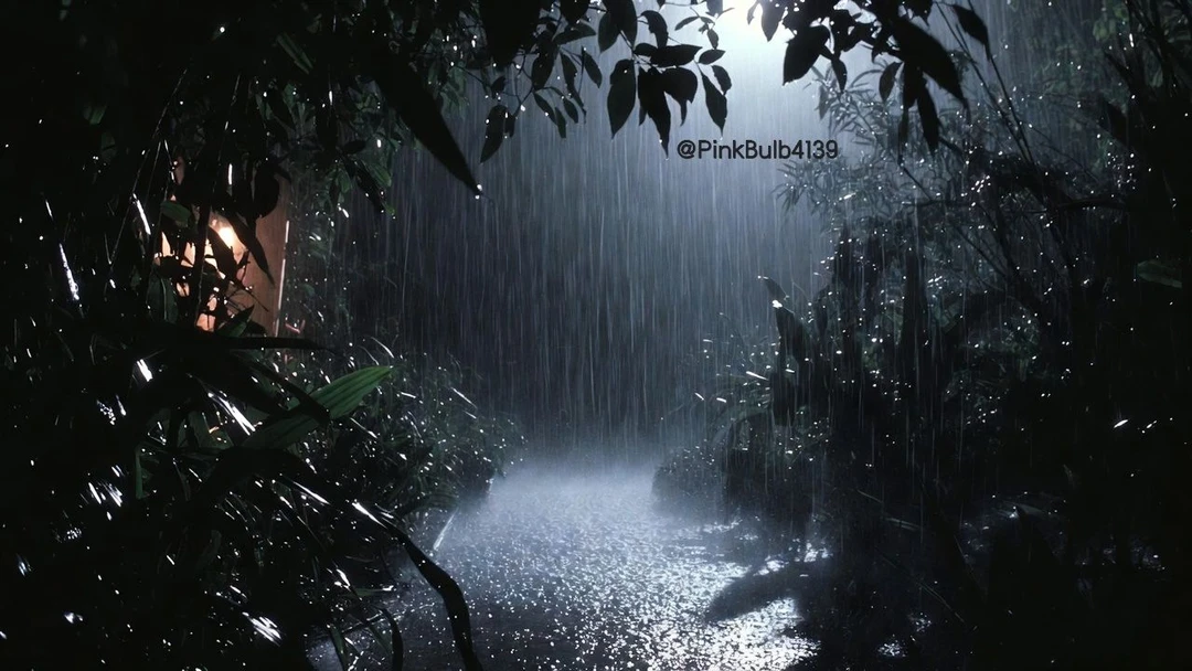짙은 구름이 하늘을 짓누르고, 장미 덩굴 사이로 떨어지는 빗방울이 잔잔한 파문을 만든다.